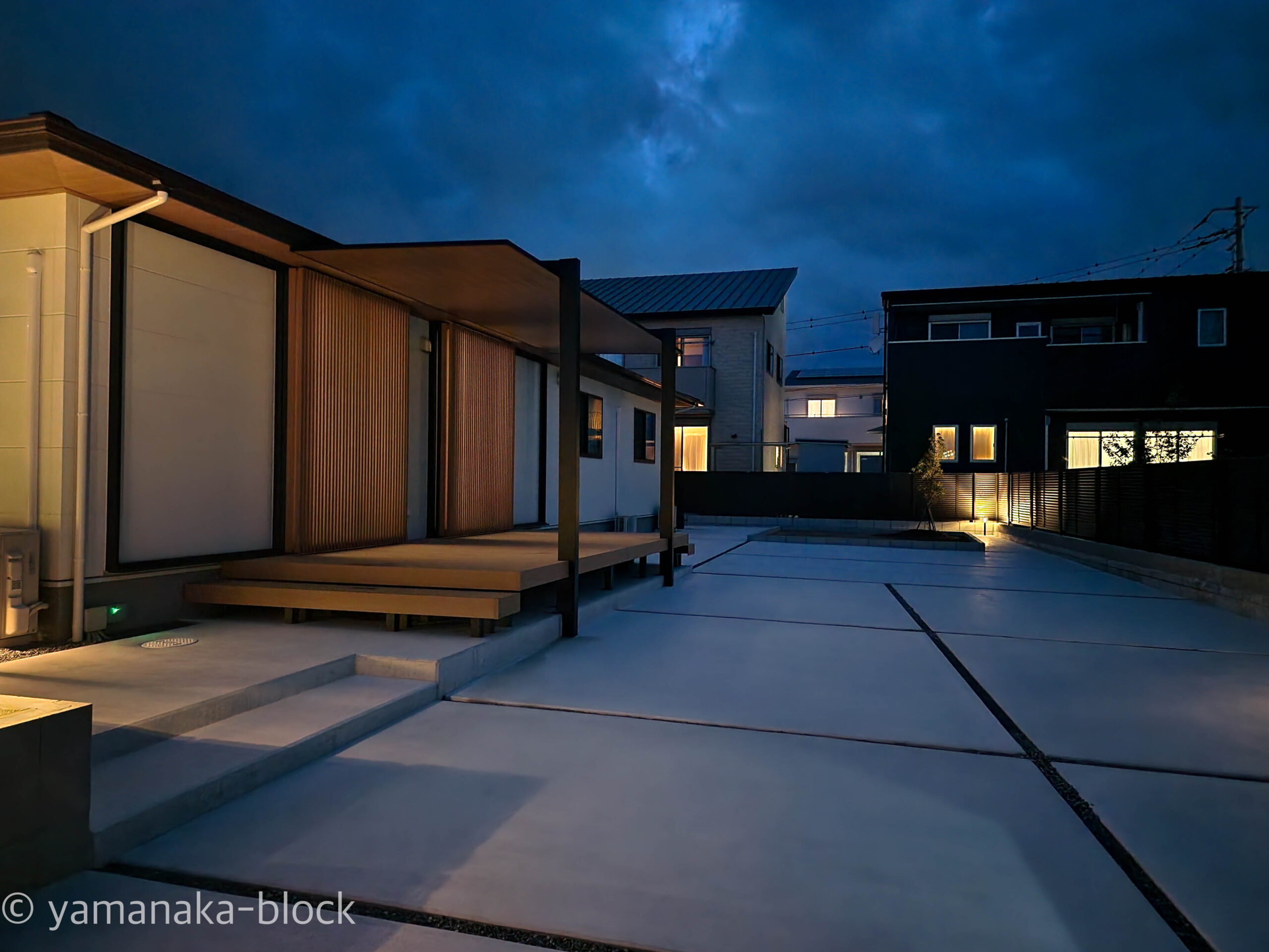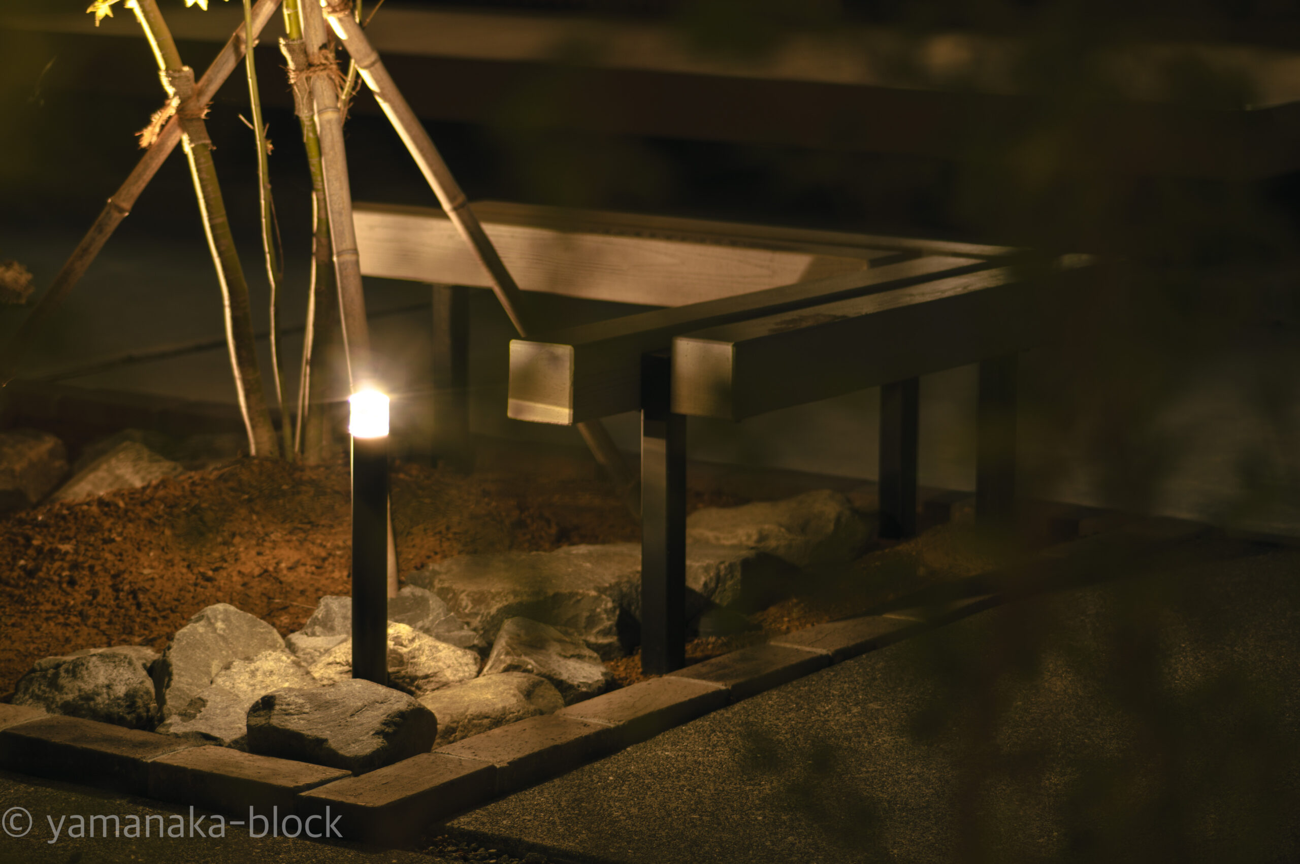 夜になると上質な雰囲気になります。 昼とは違う夜の外構が楽しめる空間。 光で庭時間を夜まで広げます。