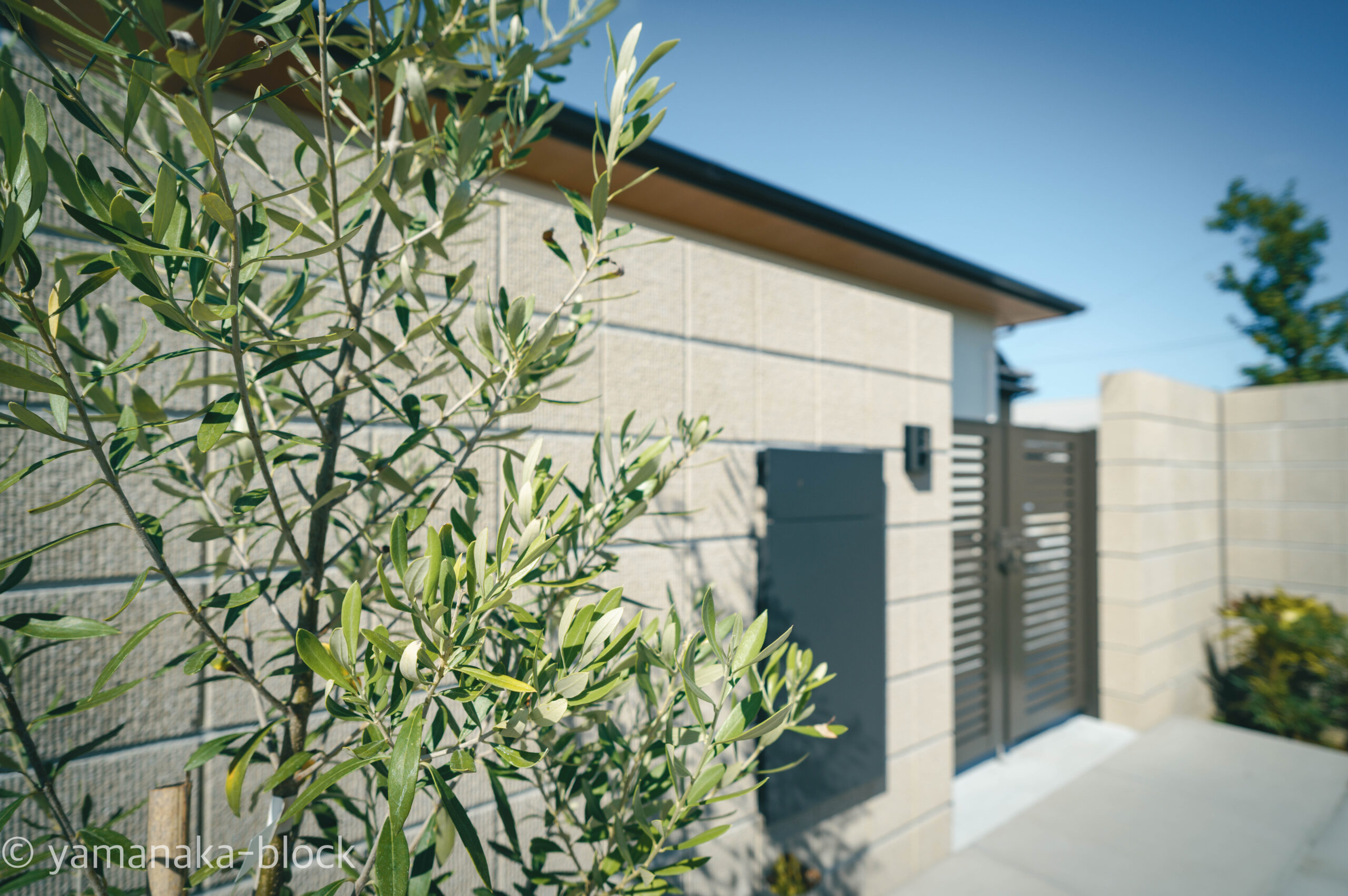 門柱前にはオリーブが。 明るい葉色で住まいの顔になります。 乾燥に強く、オススメの樹木です。