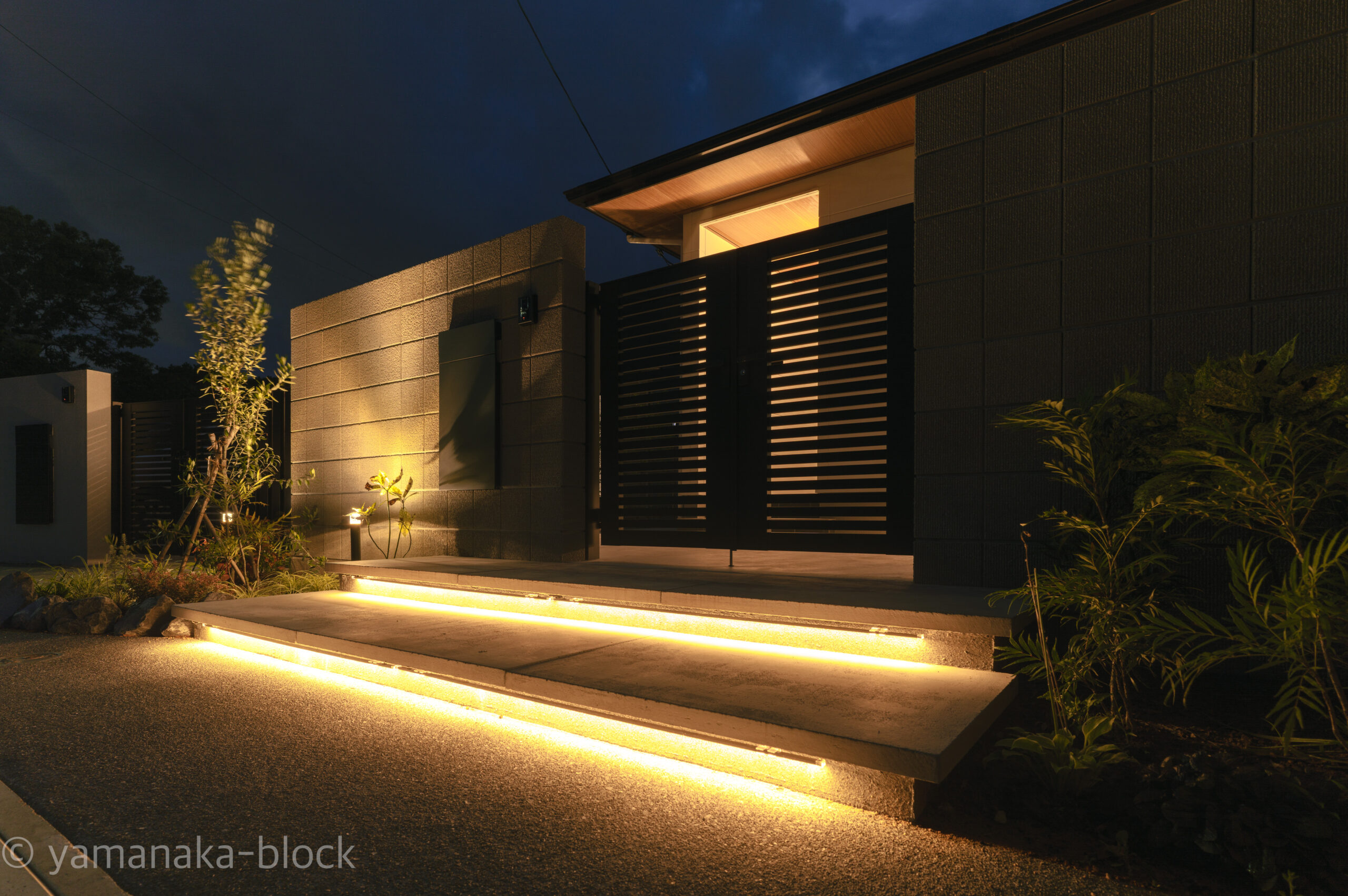 アプローチも夜にはライトアップ。 照明によって植栽、素材の質感が際立ちます。 光が玄関までやさしく導きます。
